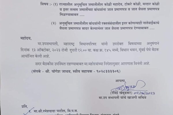 विधान भवन, मुंबई येथे मा. नीलम गोऱ्हे , उपसभापती, महाराष्ट्र विधानपरिषद यांच्या उपस्थितीत आज १३ ऑक्टोबर २०२३रोजी आदिवासी कोळी समाजाची बैठक… जात प्रमाणपत्र आणि वैधता प्रमाणपत्र बाबत समस्यांवर बैठकीत चर्चा करणार शिष्टमंडळ…!