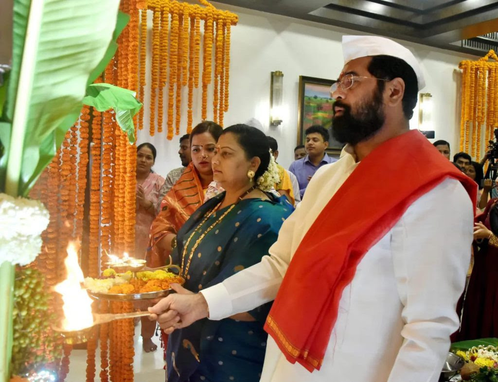 दरवर्षीप्रमाणे यंदाही मुख्यमंत्र्यांच्या ‘वर्षा’ निवासस्थानी गणरायाचे आगमन झाले. मुख्यमंत्री एकनाथ शिंदे, त्यांच्या पत्नी सौ. लता शिंदे, स्नुषा सौ. वृषाली शिंदे, नातू कु. रुद्रांश यांनी श्री गणेशाची विधिवत पूजा, आरती करुन प्रतिष्ठापना केली.